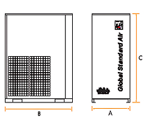 | HP | Nm³/min | A | V / Ph / Hz | kW | A mm | B mm | C mm | kg |