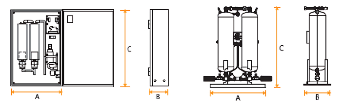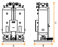| Air Compressor (HP) | Connection | Flow Rate (Nm³/hr) | Dimensions (mm) AxBxC | Weight (kg) Desiccant / Total |