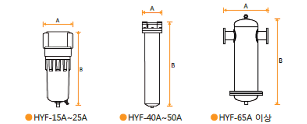 | 모델 | 유량 (Nm³/min) | SCFM | 엘리먼트 | 접속 | 크기 A (mm) | 크기 B (mm) | 중량 (kg) |